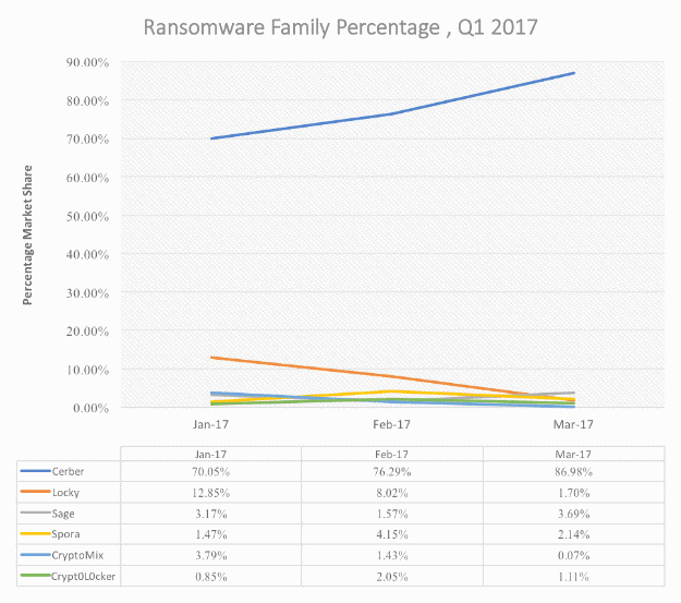 Δείτε τη διαφορά στη διασπορά των Ransomware για το πρώτο τρίμηνο του 2017 και τη σαρωτική επικράτηση του Cerber. Μετά το ξύπνημα του Locky αυτή η εικόνα ενδέχεται να αλλάξει.