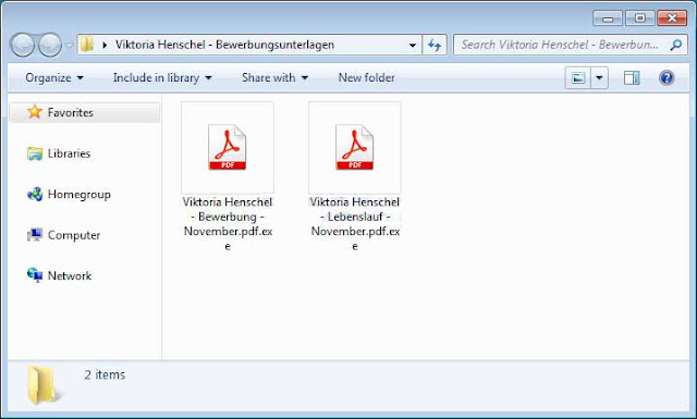 To .zip επισυναπτόμενο περιέχει δύο .exe αρχεία, τα οποία είναι μεταμφιεσμένα ως pdf με τη γνωστή μέθοδο της διπλής επέκτασης: Αν δεν είναι επιλεγμένη η προβολή των επεκτάσεων των αρχείων στα Windows, τότε ο χρήστης νομίζει ότι έχει να κάνει με αρχεία pdf και τα ανοίγει.