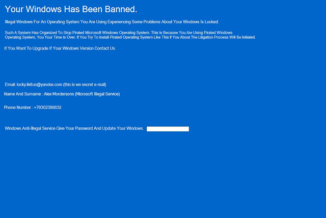 Άλλη μία τραγική έκδοση του Your Windows Has Been Banned Screenlocker εμφανίστηκε, η οποία δεν έχει καν κώδικα, απλά αυτές τις γραμμές. Αγνοήστε το.