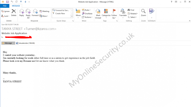 Η Myonlinesecurity.co.uk κυκλοφόρησε μια ενδιαφέρουσα ανάλυση σχετικά με τα δήθεν βιογραφικά που στέλνει κάποιος ενδιαφερόμενος για εξεύρεση εργασίας, τα οποία βιογραφικά είναι της μορφής .doc και διασπείρουν τον GlobeImposter Ransomware.