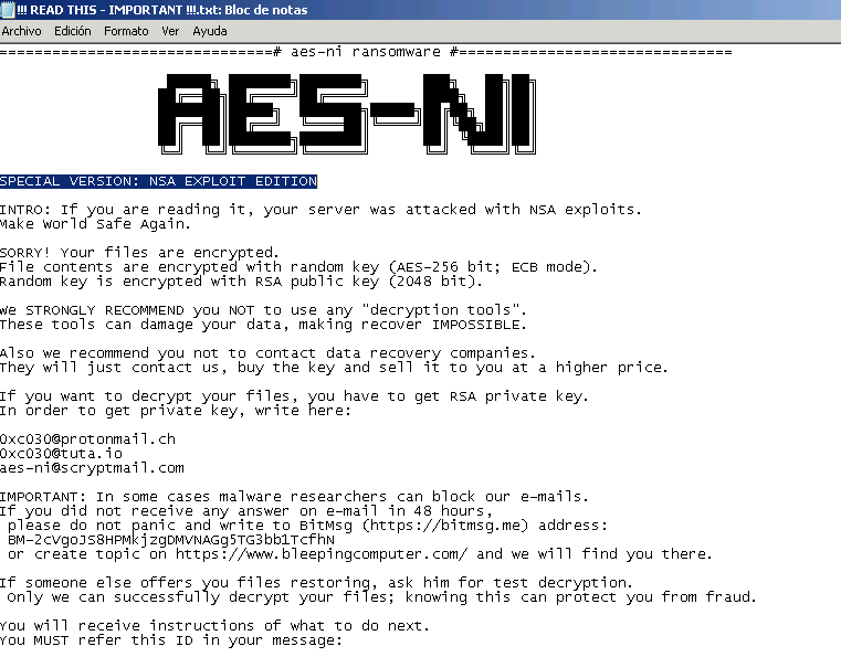 O δημιουργός του AES-NI Ransomware, σε μια σειρά tweets που έκανε, περηφανεύεται ότι κατάφερε να χρησιμοποιήσει το ETERNALBLUE exploit (το οποίο όπως αποκαλύφθηκε πρόσφατα στο wikileaks, ανήκει στη σειρά των exploits που χρησιμοποιησούμε η NSA).