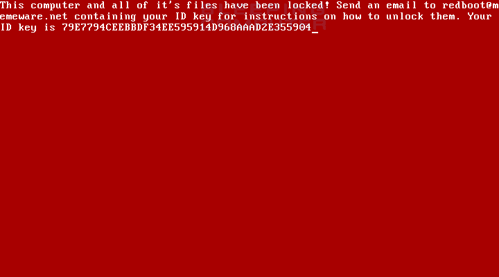 Εμφανίστηκε ο RedBoot BootLocker, ο οποίος κρυπτογραφεί τα αρχεία, αντικαθιστά το MBR (Master Boot Record) και τροποποιεί το Partition Table. Τα νεα δεν είναι καλά για όποιον έχει μολυνθεί από αυτό το Ransomware, καθώς, αν και βρήκαμε τρόπο να αποκρυπτογραφήσουμε τα αρχεία, δεν είναι δυνατόν να βρούμε δομή, καθώς τόσο το MBR όσο και το Partition Table, αν και μπορούμε να τα δημιουργήσουμε ή να τα αποκαταστήσουμε, κρυπτογραφούνται εκ νέου. Δουλεύουμε στην εξεύρεση λύσης για αυτό.