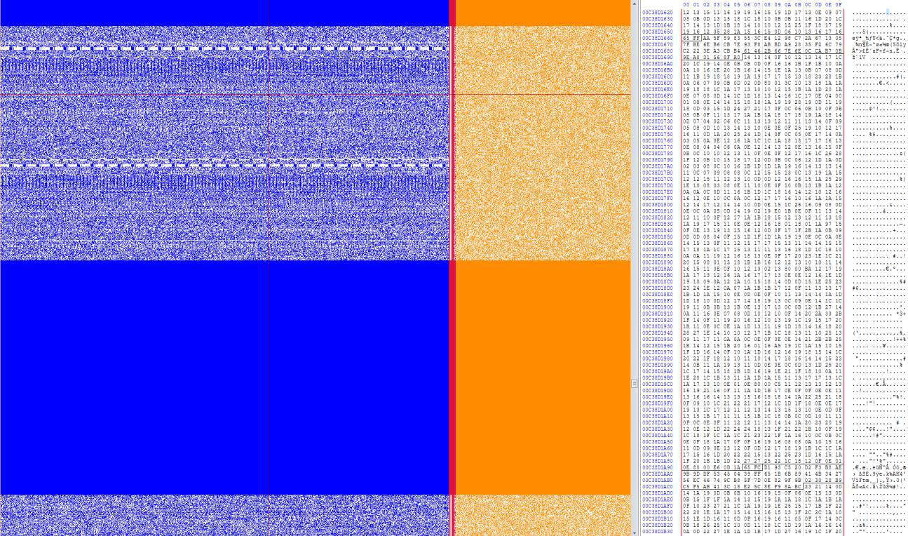 Παρακάτω φαίνεται μία απεικόνιση των pages που αποθηκεύονται σε ένα NAND chip. Βλέπουμε την γραφική αναπαράσταση καθενός bit (8 bits = 1 byte), όπως επίσης και την “μετάφραση” σε δεκαεξαδική μορφή στο δεξί μέρος. Το page έχει σπάσει στο μπλε τμήμα που αντιπροσωπεύει τα δεδομένα, στο κόκκινο τμήμα που περιέχει το Service Area (metadata) και το πορτοκαλί τμήμα που είναι το ECC που αναφέραμε προηγουμένως.